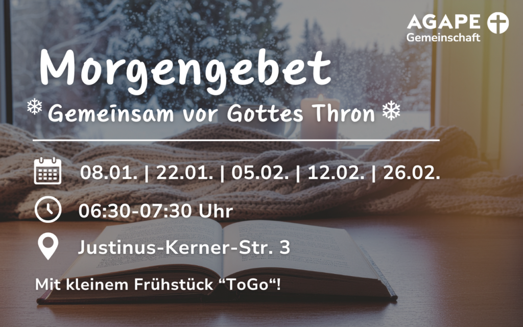 Dann abonniere unseren News Kanal. Einmal pro Woche senden wir eine kurze Nachricht mit wichtigen Neuigkeiten & bevorstehenden Veranstaltungen – solchen bei AGAPE, aber auch anderen christlichen Events im Raum München. Bleib am Ball!