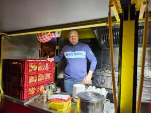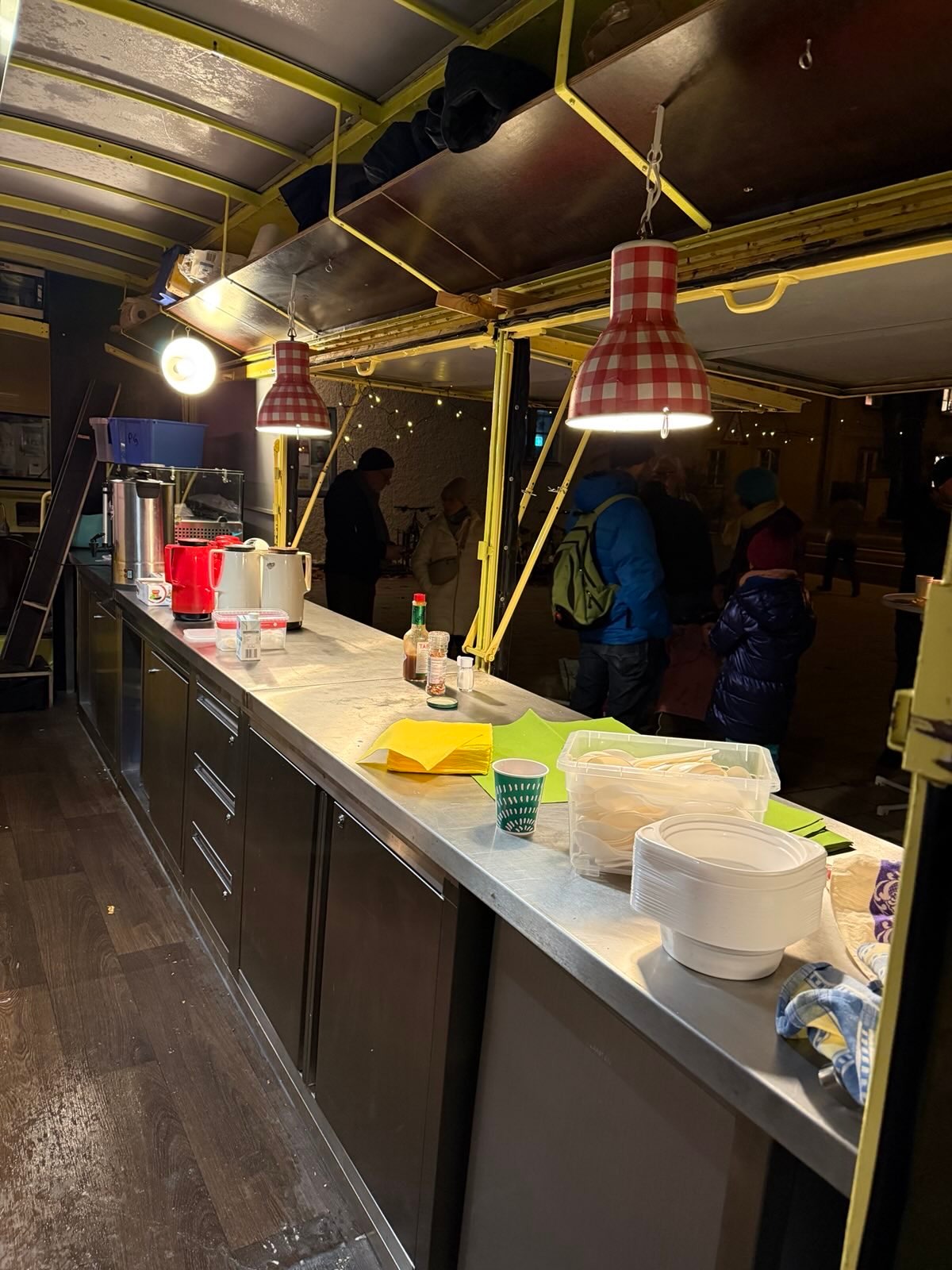 Der Start unseres Foodtruck-Projekts verlief zunächst etwas holprig. Zuerst verzögerte sich die Fertigstellung des Wagens immer wieder, anschließend zog sich die Genehmigung für die Aufstellung über mehrere Wochen hin. Und als es schließlich losgehen konnte, stand uns zunächst kein Strom zur Verfügung – wir improvisierten kurzerhand mit Strahlern und Kerzen und arbeiteten im Halbdunkel.